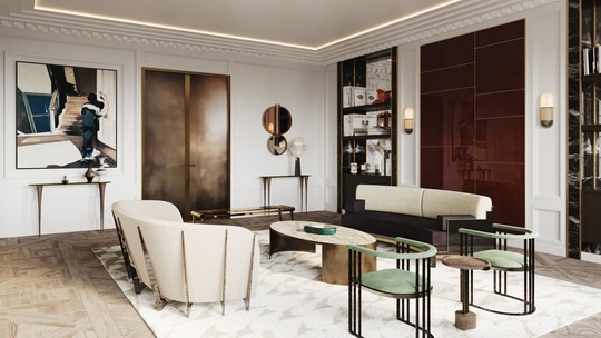 De gauche à droite : Consoles Close to me, Damien Langlois Meurinne – Canapé Télémaque, Jean-Louis Deniot, Paire de chaises Hug, Humbert & Poyet – Guéridon Versatile, Stéphane Parmentier – Table basse Passage, Sybille de Margerie – Appliques Sélène, Jean-Louis Deniot – Canapé Tweed, Tristan Auer, Panneau mural L’exigeante, Pouenat