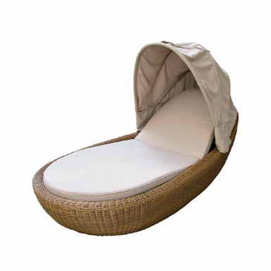 Version couffin pour ce bain de soleil en rotin synthétique au charme classique revisité. Avec sa capote relevable, vous serez, si vous le souhaitez, protégé du soleil, pour une sieste en toute sécurité. Blum, structure en aluminium et résine synthétique tressée. Dim. : L. 220 x l. 100 x H. 120 cm, déhoussable, 1 199 €. Truffaut.
