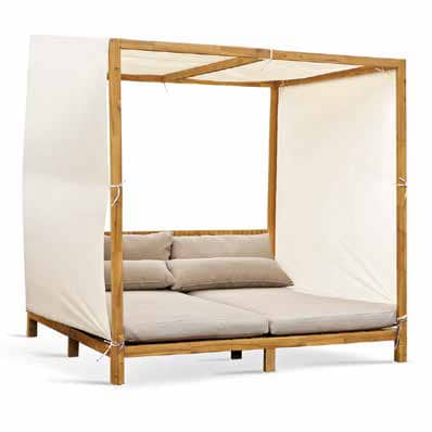 Qui n’a pas rêvé d’un lit à baldaquin installé au fond du jardin ou dans un coin de la terrasse ? Le voici avec ses coussins moelleux et son cadre en acacia ultra robuste. Dès qu’il fait beau, vous allez adorer passer la nuit à la belle étoile. Lit Seychelle, Dim. : H. 195 x l. 194 x L.195 cm, 1 590 €. Ovalia.