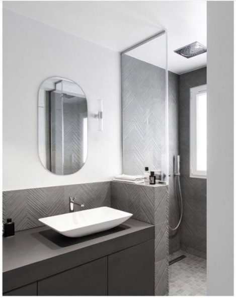 Style et allure assurés avec le choix d’un carrelage 3D pour cette salle de bain contemporaine Jeu de matières et de lumière avec une même référence de carrelage déclinée en 3 textures différentes : 3D pour le mural, mosaïque pour le sol de la douche, lisse pour le sol de la salle de bain. Miroir oblongue et vasque adoucie pour apporter de la douceur à une salle de bain chic et structurée.