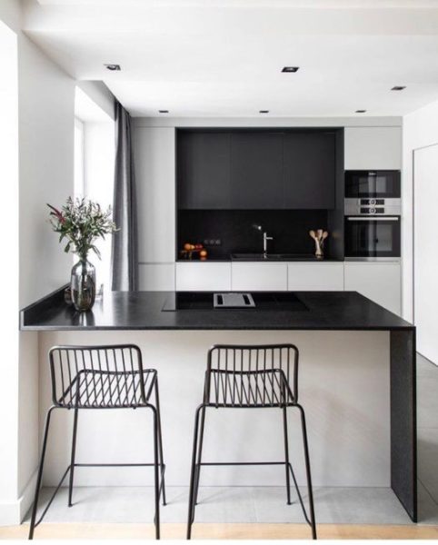 Meubles haut et encadrement en médium laqué noir pour un jeu de couleurs qui se répondent. Plaque de cuisson avec hotte intégrée. Lignes structurées. Sobriété et rigueur pour une cuisine high-tech !