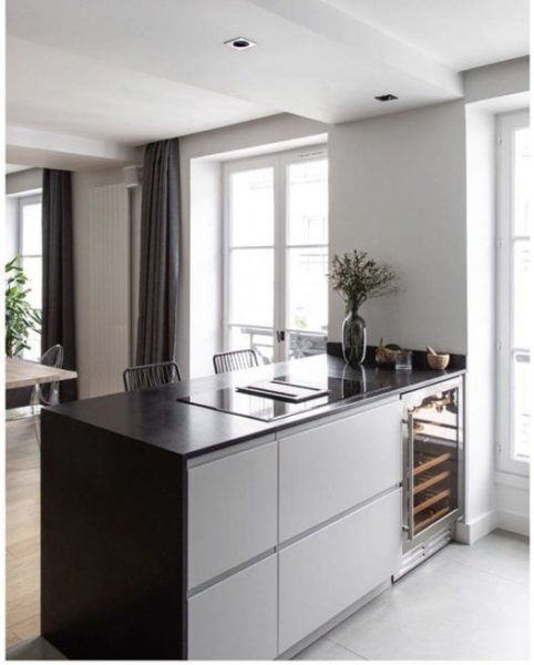 Dans cet appartement refait entièrement, Laetitia Marfisi a souhaité décloisonné l’espace pour créer une grande pièce de vie très lumineuse composée d’une cuisine ouverte avec îlot central, un espace salle à manger et un salon. On se retrouve, pour le plus grand des plaisirs, dans un cocon design au coeur de Paris.