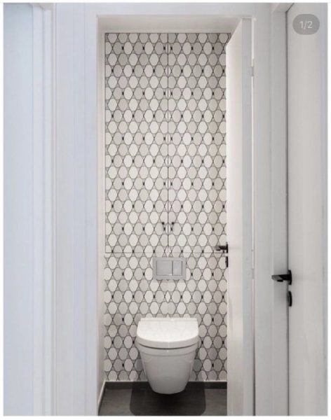 Dans la continuité de la salle de bain, le carrelage du sol se retourne dans les WC. En verticalité, même tonalité mais ajout d’une note de fantaisie et d’élégance avec la sélection d’un papier peint effet graphique.
