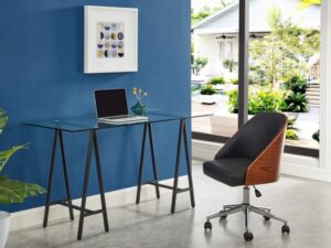 1. Original, le bureau BELISAMA marie deux matériaux qui se complètent à la perfection : le verre trempé et le métal noir. Pour un rendu aussi surprenant que solide qui apportera originalité et légèreté à votre salon.