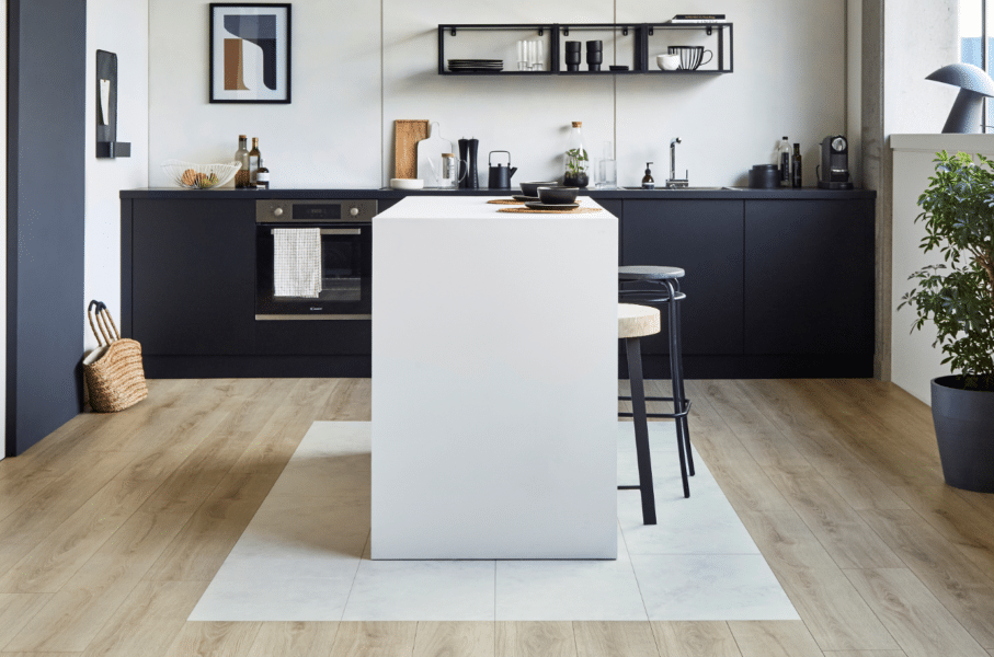 Mixez un parquet stratifié avec un sol effet béton, séparez deux pièces grâce au sol effet carreau de ciment, délimitez votre ilot central avec le revêtement imitation marbre…