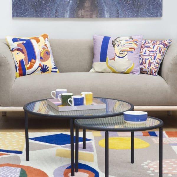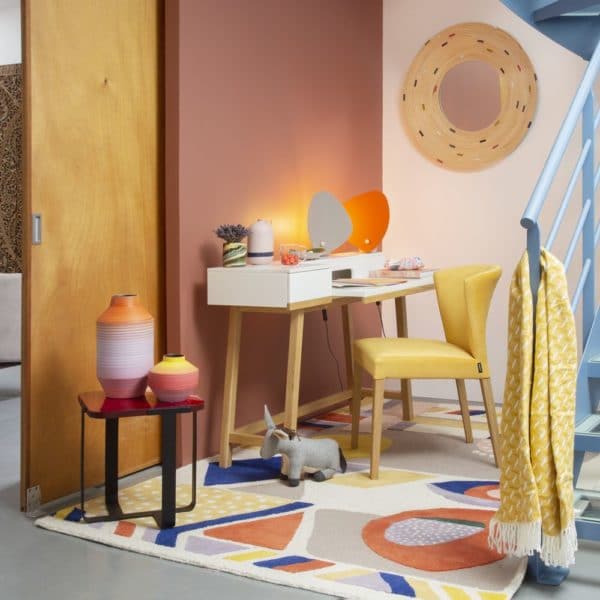 Pensez à apporter de la couleur sur vos meubles : canapé flashy, meubles peints… Et sur les objets de décoration : coussins (coussin Roxane Habitat, 39€), bibelots, vases, tapis (tapis en laine Raoul Habitat, 439€.)…