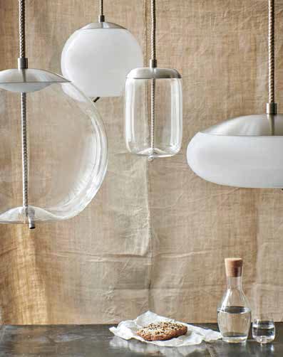 Dans cette ambiance brute couleur de lin et de ficelle, apportez une touche de raffinement grâce à ces luminaires en verre soufflé suspendus par des cordes rugueuses. Collection Knot de Brokis, prix selon le modèle, à partir de 1 574,21 €.