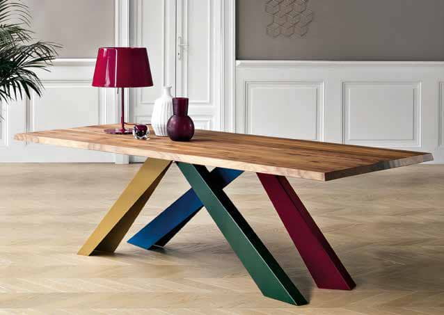 Qu’il soit brut ou raffiné, le bois s’harmonise avec les matériaux les plus contemporains comme l’acier laqué ou le bronze pour des associations très design. Avec son plateau fixe ou extensible, disponible en placage de bois, bois laqué, bois massif ou bois à bords naturels, Big Table possède une structure et des pieds en acier laqué en différentes couleurs. Dim. : 200 x 100 cm, extensible à 300 cm. A partir de 1 988 €.