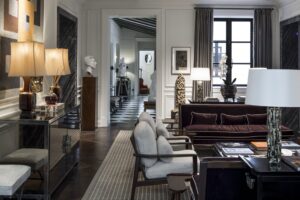 A l’image des autres J.K. Place, c’est le décorateur florentin Michele Bönan qui en signe le cadre et les décors éclectiques et référencés, jusque dans les moindres détails, entre mobilier contemporain inédit spécialement dessiné pour l’hôtel et portant la patte Bönan reconnaissable entre mille, et nombreuses pièces uniques signées Jacques Adnet, David Hicks, Jansen, Poillerat…, chinées avec patience et flair aux Puces de Saint-Ouen auprès des meilleurs marchands.