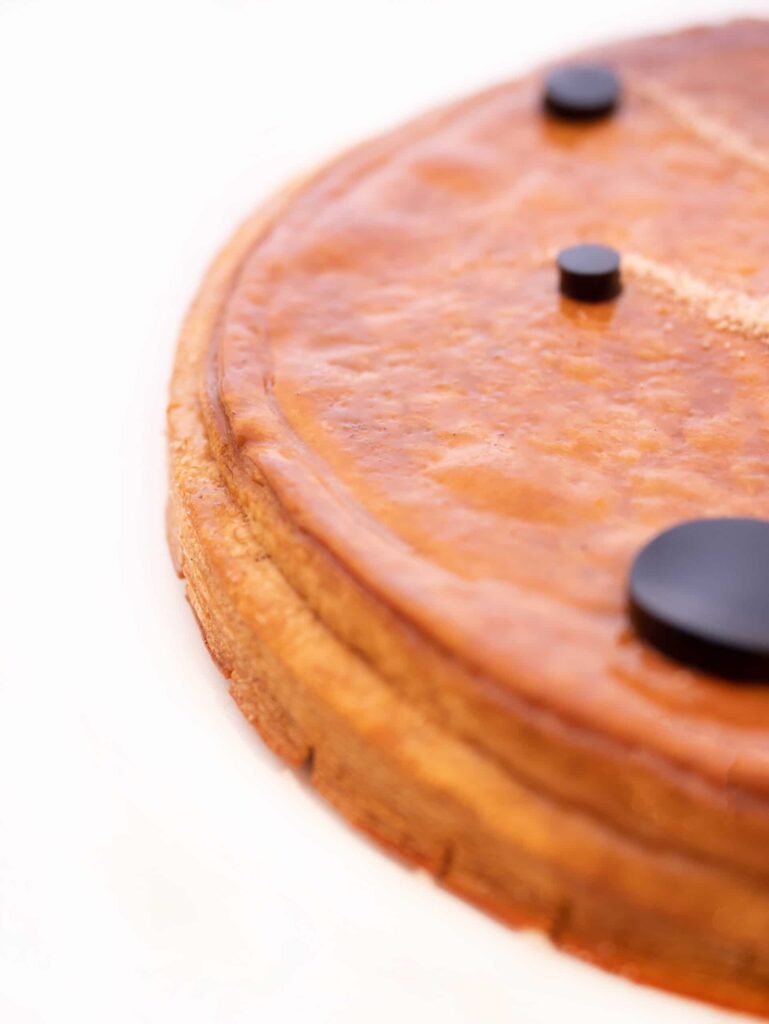 Pour cette galette des rois exclusive, Pierre Chauvet a choisi de mettre en lumière la noix de Grenoble dans une frangipane ultra fondante au cœur d’un feuilletage croustillant. À ses côtés la myrtille du plateau ardéchois comme touche fruitée pour révéler l’élégance d’un entremet de fête.