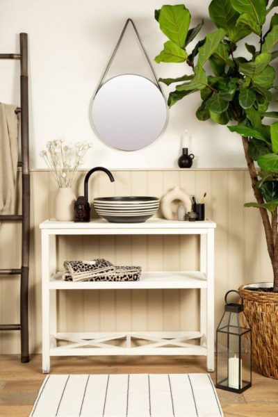 Commenez par choisir des meubles dans des matériaux naturels. Bois, osier, rotin, bambou… Pour le meuble sous la vasque, les rangements (meubles de salle de bain, étagères, banc…).
