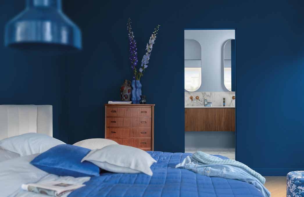 Le bleu révèle tout son potentiel lorsqu’il dialogue avec d’autres couleurs et matériaux. Associé à des fibres naturelles, il devient chaleureux et réconfortant. Marié à des bois foncés ou à des matières nobles, il gagne en sophistication. Plus vif, il se fait dynamique lorsqu’il rencontre des touches de couleurs franches ou des finitions brillantes.