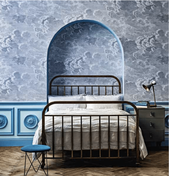 On aime ce côté lumineux, coloré, avec des motifs pour une chambre à la forte personnalité. Dans leurs nuances les plus colorées, les grands motifs vont créer une ambiance dynamique et joyeuse, plus propice au travail qu’au repos. Du coup, n’hésitez pas à les associer avec de grandes plages d’unis qui vont calmer le jeu. Soubassement, sol, plafond… c’est aussi le moment d’utiliser la technique de zoning, en posant un seul lé de ce papier peint à grandes arabesques et super coloré pour lequel vous venez de craquer !