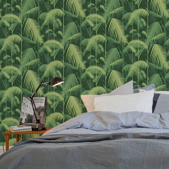 On aime le rapport entre le motif très présent et les huisseries et soubassements en uni foncé. Papier peint intissé Palm Jungle, rouleau de 0,52 x 10 m, 132 €. The Contemporary Collection Cole & Son distribué en France par Au Fil des Couleurs.