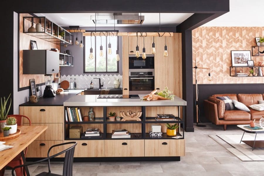 La tendance industrielle reste omniprésente pour la décoration de la cuisine en 2021. Pour créer un cuisine indus, il faut : du bois, du métal, du métal vieilli, du noir, du gris, des touches de bleu électrique ou même de jaune.