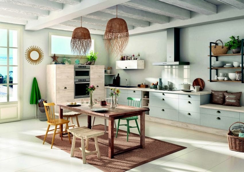 On adore les cuisines tout en vert, clair ou foncé. Et, dans un esprit nature, on associe le vert à du bois. Pour jouer à fond la carte nature dans la cuisine, on pose un beau papier peint à motifs végétaux ou même tropical sur un mur de la cuisine. On invite la (vraie) nature dans la pièce avec des plantes vertes et autres pots d’aromates à cultiver à l’intérieur (on peut les sortir aux beaux jours).