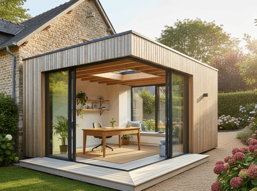Une fois raccordée à l’électricité, et parfois à l’eau selon l’usage, la micro-extension peut devenir : un bureau lumineux pour télétravailler au calme, une chambre d’amis confortable, un atelier créatif, un espace bien-être, ou même une mini-suite indépendante.