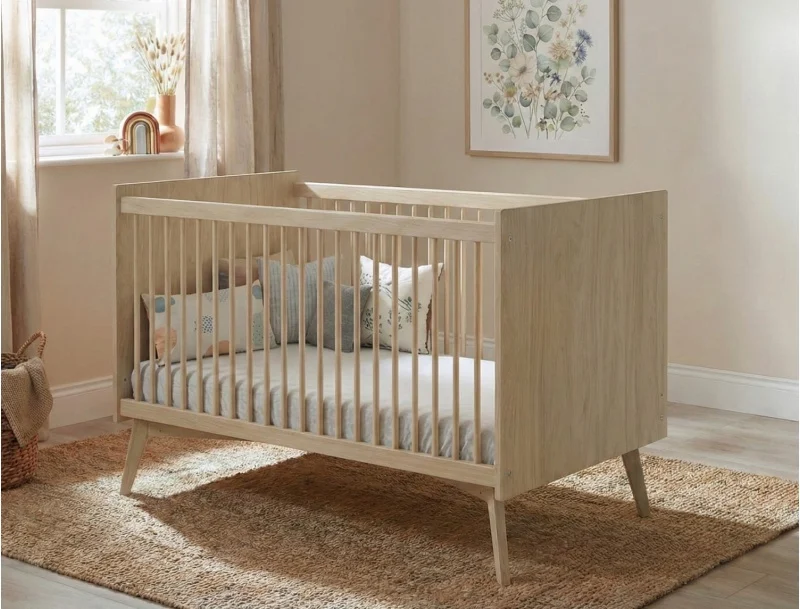 Le principe du lit évolutif repose sur sa modularité. Dans sa première configuration, il ressemble à un lit bébé classique avec des barreaux qui assurent la sécurité du nourrisson pendant ses premiers mois.