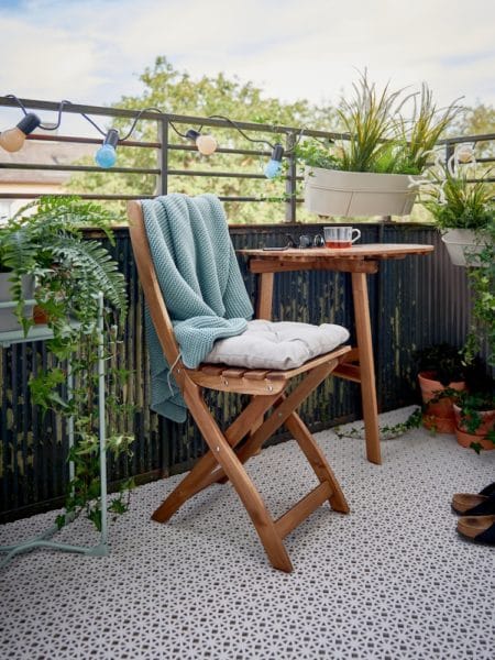 Vous pouvez aussi opter pour des caillebotis, ces carrés de bois à placer au sol et à encastrer les uns avec les autres. Votre petit balcon sera facile à décorer, tout de bois recouvert, joli et facile à entretenir. Et c’est agréable de marcher pieds nus sur le bois…