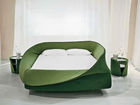 Inventif, le lit « Colletto » et ses chevets nous font craquer. Sa collerette se relève jusqu’à 92 cm. Déhoussable....