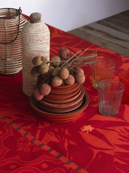 Nappe enduite (à partir de 142€) et serviettes de table (15,90€), collection Bahia, coloris Sunset