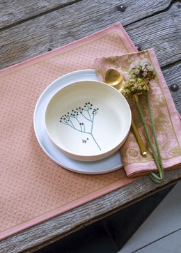 Sets de table (15,90€ ), coussins de chaise (45€) et serviettes de table (15,90€), collection Nature Urbaine, coloris Quartz