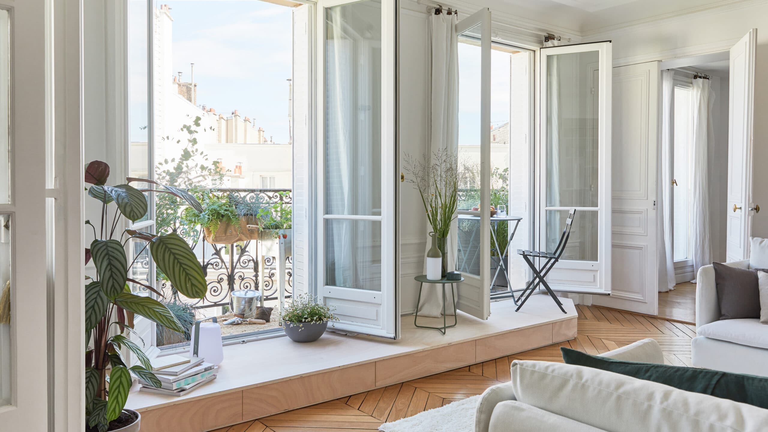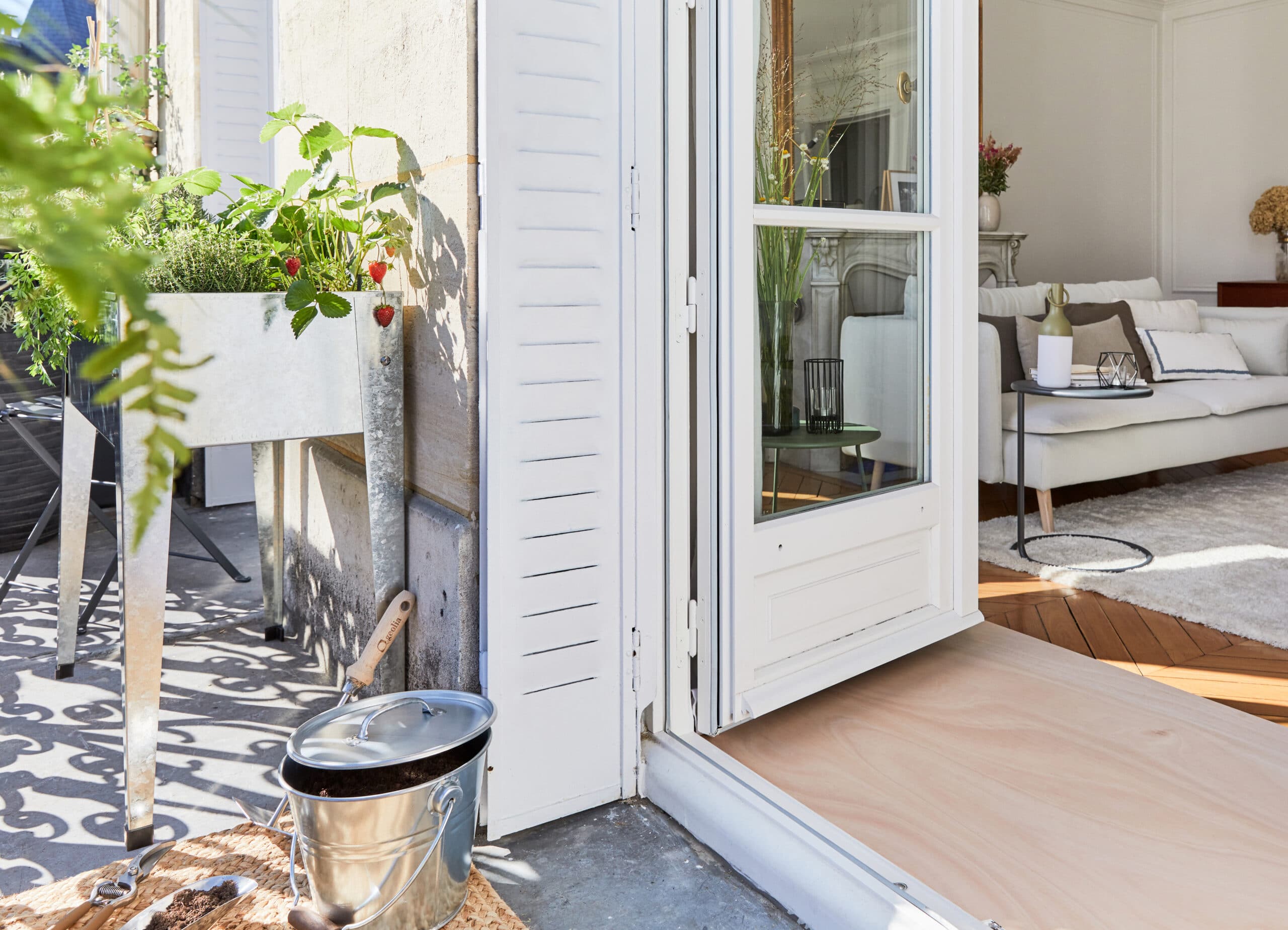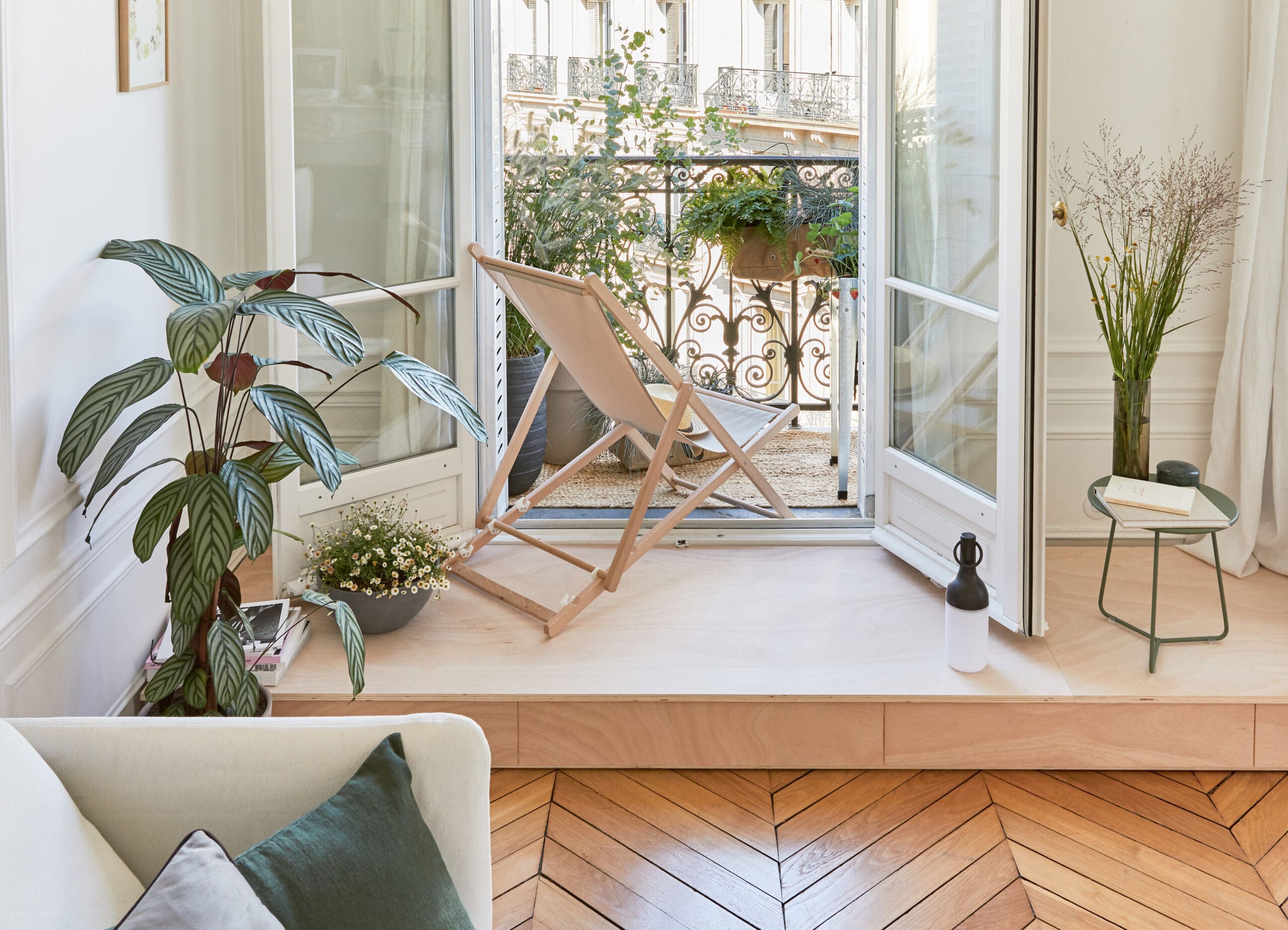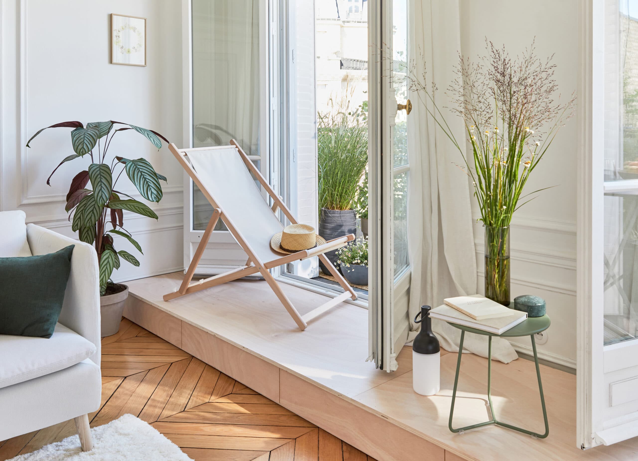 Fenêtres grandes ouvertes, on y installe une table et des chaises pliables, une chilienne et du végétal à foison.