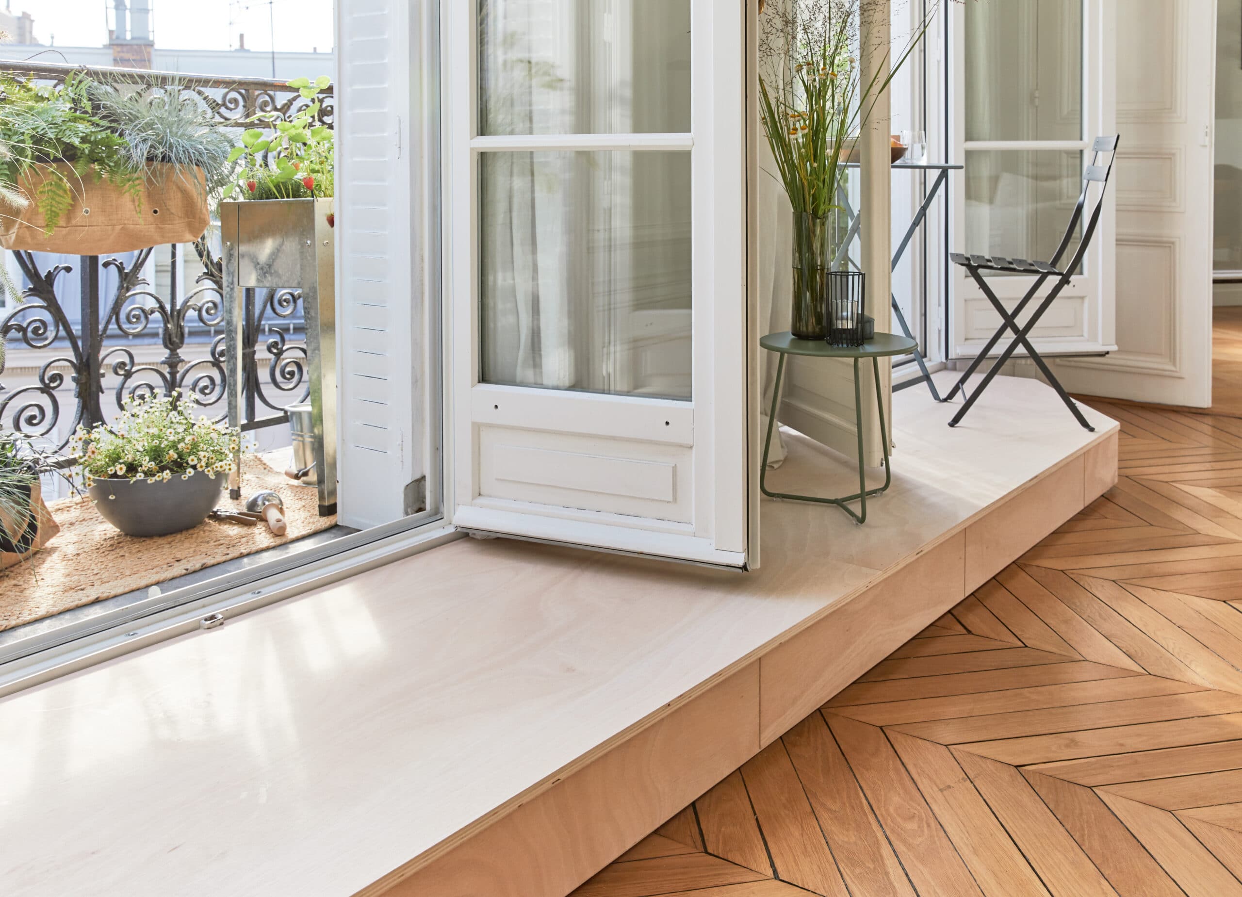 Salon de balcon, la bonne idée ? Jouer les prolongations dans le salon grâce à une estrade réalisée à l’intérieur.