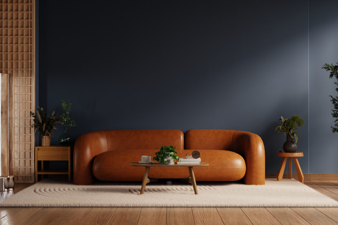 Living room features a sophisticated design with a rich dark blue accent wall, complemented by a stylish orange leather sofa- 3D rendering