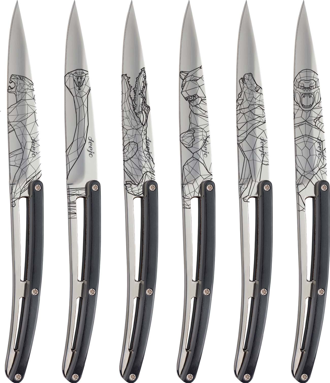 Richard Orlinski et Deejo ont donné naissance à pas moins de 4 nouvelles collections allant du set de 6 couteaux aux deux modèles de poches. Les premiers sont ornés du magnifique bestiaire Orlinski, les deux autres arborent l’œuvre la plus célèbre de l’artiste : le Kong.