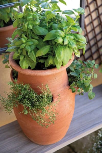 Pour les végétaux, il nous faut des pots. Le pot Umbriea, en terre cuite et de fabrication italienne, a 3 poches dans lesquelles planter plusieurs végétaux (42,95€). Pour ajouter une touche déco vintage, on place des piques de jardin Yara, en métal coloris rouille.